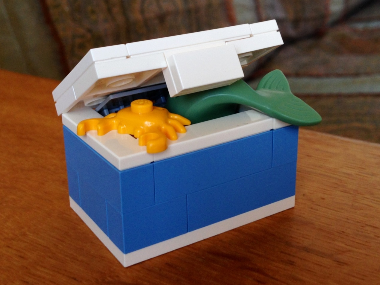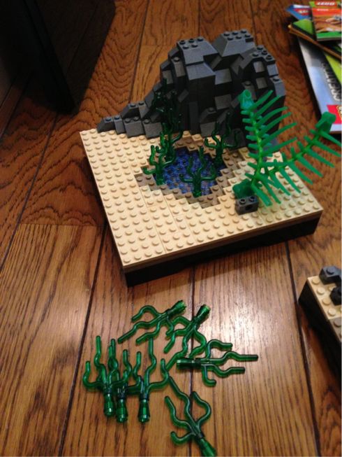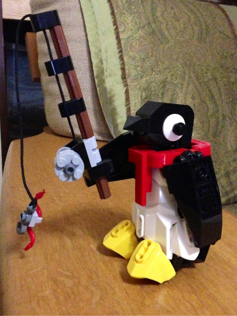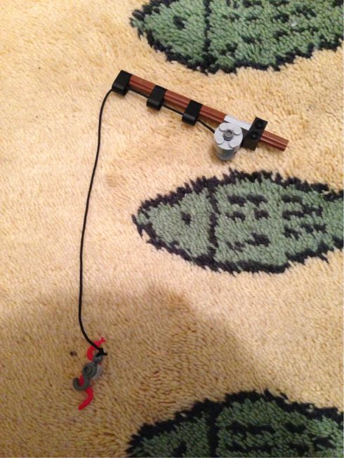 釣り針はクレーン用のフック、餌のミミズはヘビのフィグを使用。「レゴのヘビって何で赤なの?」と長年不満を抱いていましたが、そういうのに限ってドンピシャな見立てがあるからレゴは侮れない。