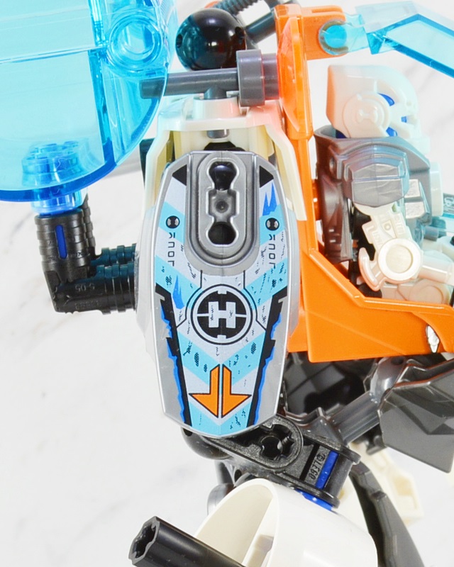 図案の「ヒーローファクトリーのシンボル」と「矢印」はバトルマシーンのプリント入りアーマーの共通要素になっていて、フリーズマシーンのものは冷凍系の能力をイメージしたカラーリングになっています。
