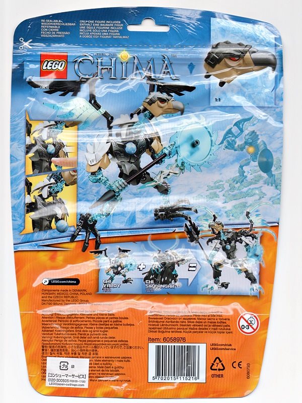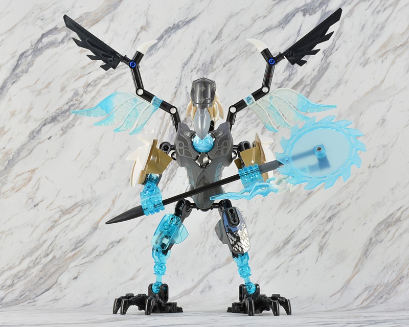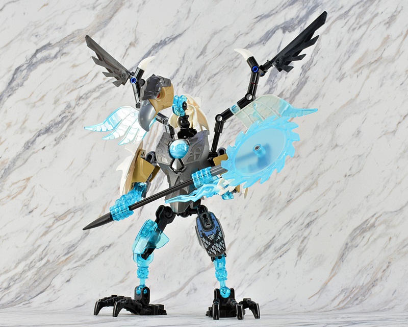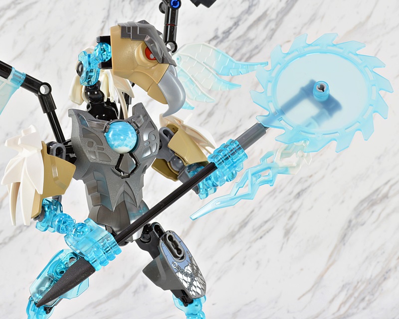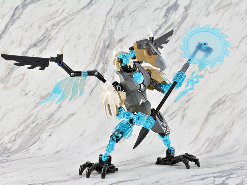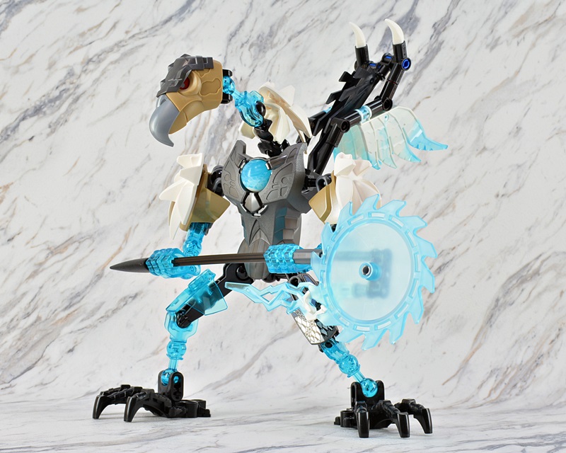 バーディーが空から急降下して攻撃をしかけるぞ! 「チ」でパワーアップしたこのコンドル族の戦士には巨大ウイング、レッグ・アーマー、するどいツメが付いているぞ。チェスト・アーマーに装着いる「チ」の球を守りぬくことができるかな。手足を動かして戦闘ポーズをとらせよう。アイス・ソーブレードを回転させれば、誰も近づけない!