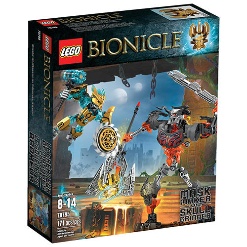 It's the ultimate battle between good and evil with the LEGO BIONICLE Mask Maker vs. Skull Grinder set. Join forces with the wise Mask Maker to prevent Skull Grinder from taking the powerful Mask of Creation. Activate the battle arm functions and pit these figures in fun combat. Set includes Mask Stealer Staff and the Hammer of Power’s rapid shooter.