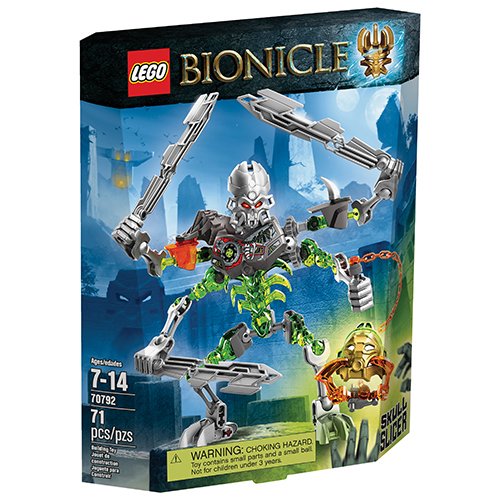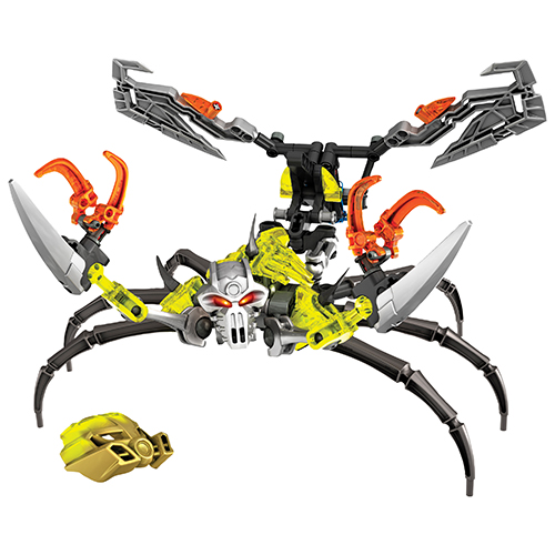 Patrol the ruins of the ancient arena with the menacing LEGO BIONICLE Skull Slicer, an ancient champion animated by the dark magic of the Skull Spider Mask. Create fearsome combat poses and turn the wheel on Skull Slicer’s back to activate the 4 battle arms all at once. Use the hook blades to rip off masks and pick them up with the mask grabber.