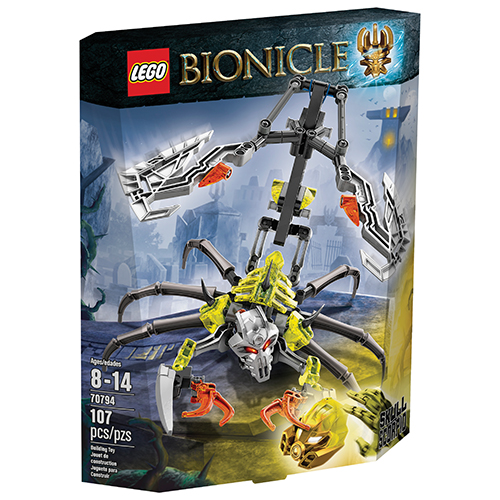 Brave the dark burial ground of the ancient city in search of lost masks of power with the LEGO BIONICLE Skull Scorpio. It features a trigger-activated battle stinger with 2 hook blades and gripping pincers. Combine the Skull Scorpio with the Mask Maker vs. Skull Grinder set (sold separately) to create a powered-up Skull Grinder.
