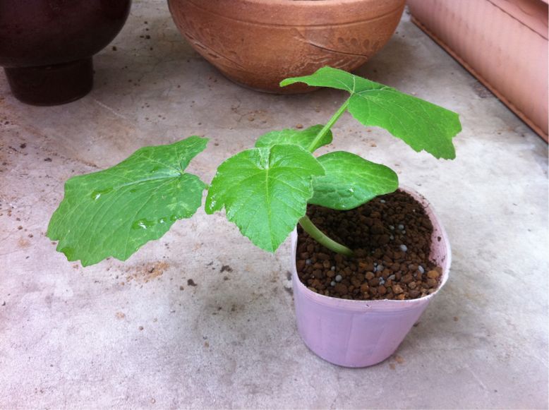 西洋カボチャの苗。大元はスーパーで買ったカボチャに入ってた種だったりします。