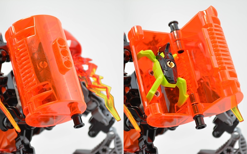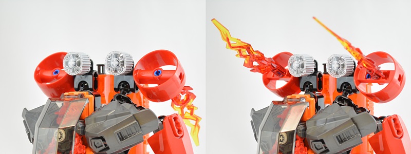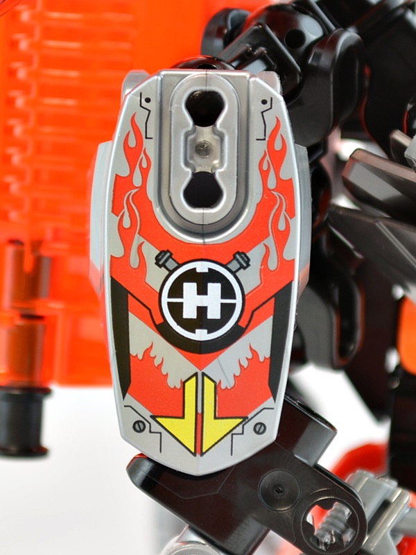 バトルマシーンのプリント入りアーマーの共通要素である「ヒーローファクトリーのシンボル」と「矢印」に加え、ファーノの炎をイメージしたファイヤーパターンが描かれているのが特徴的。